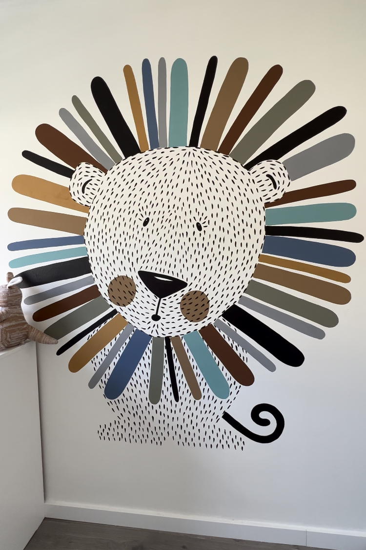 We decided to paint one wall with a lion, using a color palette that matches the carpet. This not only makes the room more interesting but also reduces the need for additional decorations.